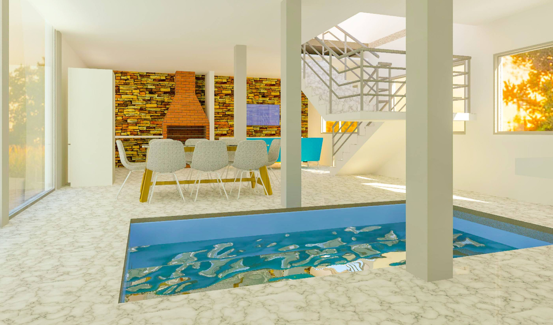 Este é o projeto de um anexo de uma residência existente. Foi um trabalho particularmente desafiador, pois o cliente já tinha locado os pilares da futura construção, algo bastante incomum. Além disso, foi solicitada ainda uma piscina coberta, de modo que o desafio estava em conseguir um espaço fluido, funcional e agradável mesmo com a presença constante dos elementos estruturais.