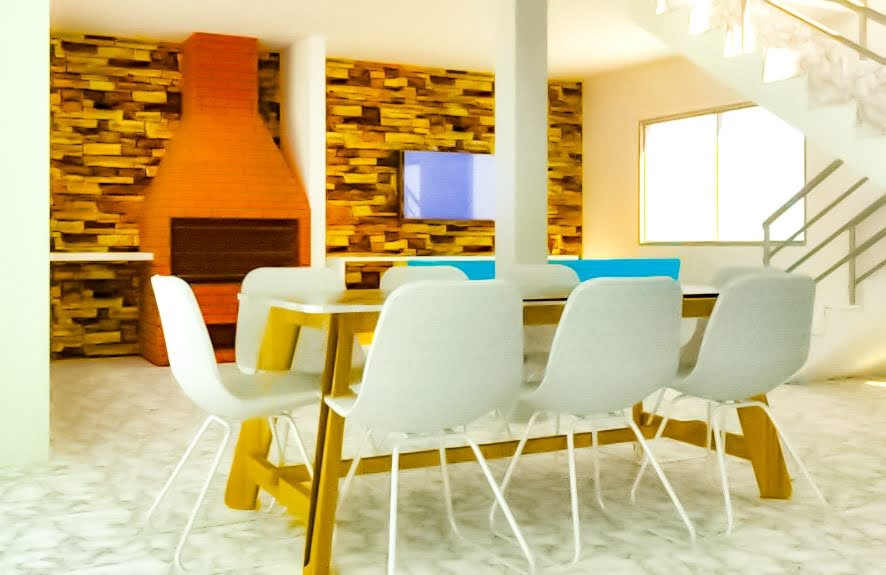 Na área gourmet, a churrasqueira em tijolo cerâmico permite a cocção com segurança, com o duto de exaustão pela parte externa, além das janelas em paredes opostas promovendo o frescor do espaço. A integração dos espaços de cozinha e estar entram como elemento chave também, em um programa que mescla as funções de lazer e de residência, contando ainda com uma suite no pavimento superior.